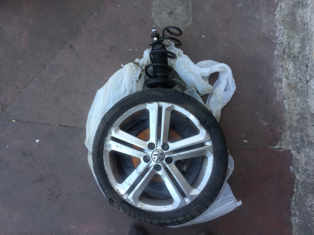 vehiculo con golpe delantero derecho afectando a mecanica de rueda y lateral lado golpe,arranca,cd,clima.